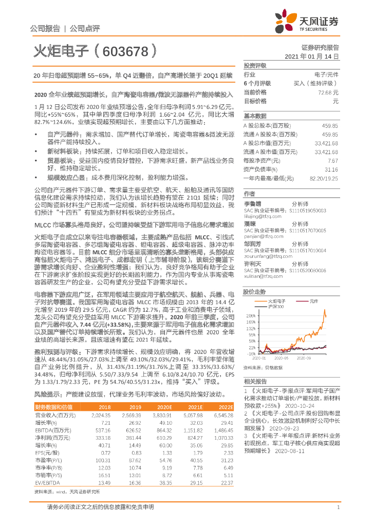 天风证券:火炬电子(603678)-20年归母超预期增55~65%,单Q4近翻倍,自产高增长望于20Q1延续.pdf