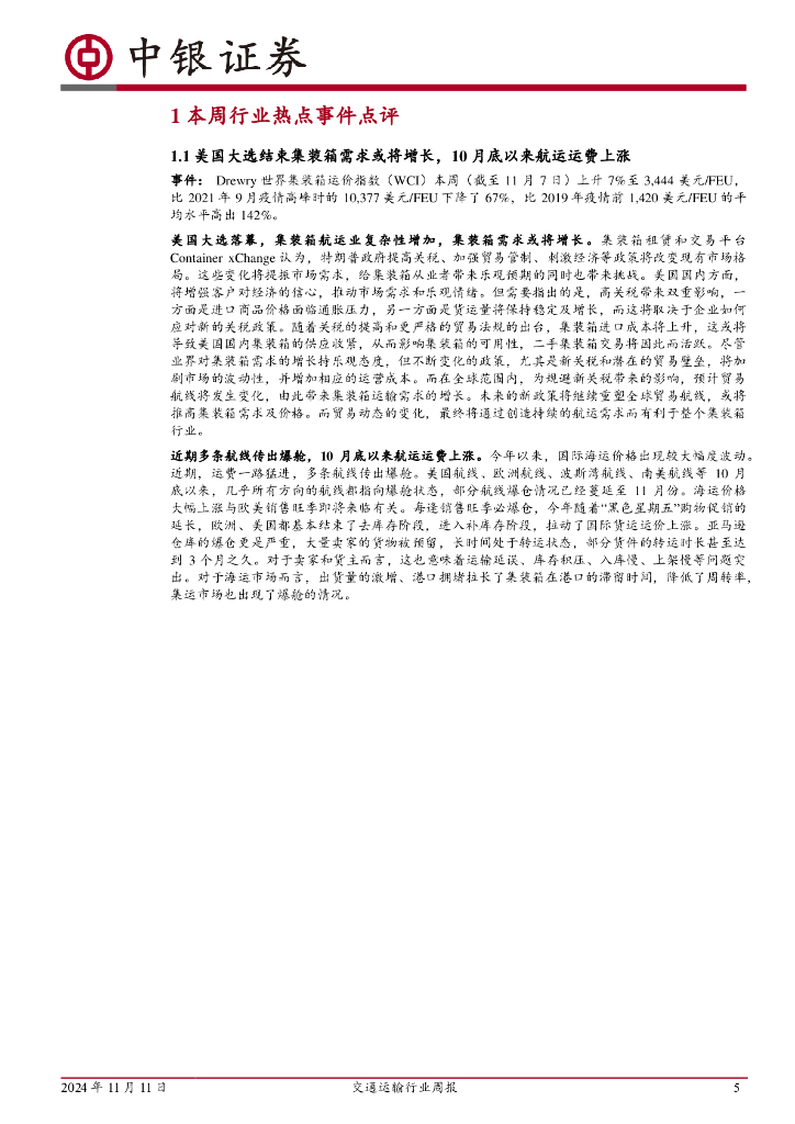 中银证券:交通运输行业周报:美国大选结束集装箱需求或将增长,今年“双11”快递业务量预计维持高位.pdf