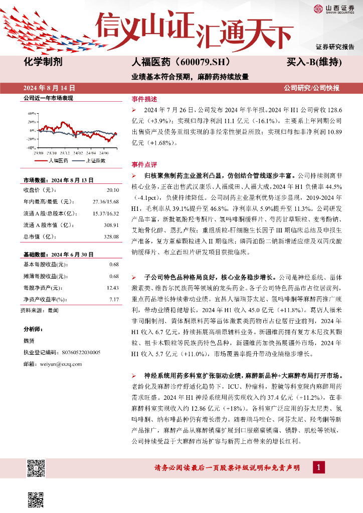 山西证券:人福医药(600079)-业绩基本符合预期,麻醉药持续放量.pdf