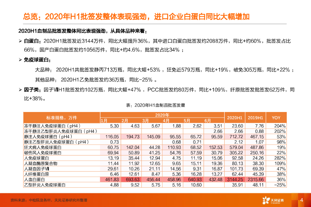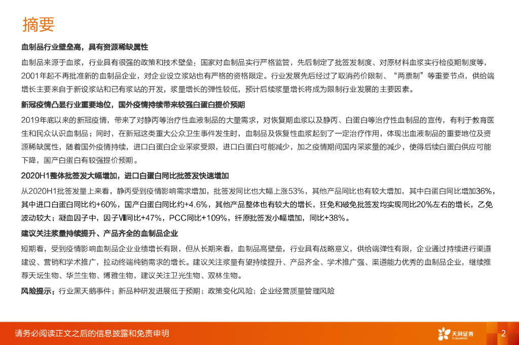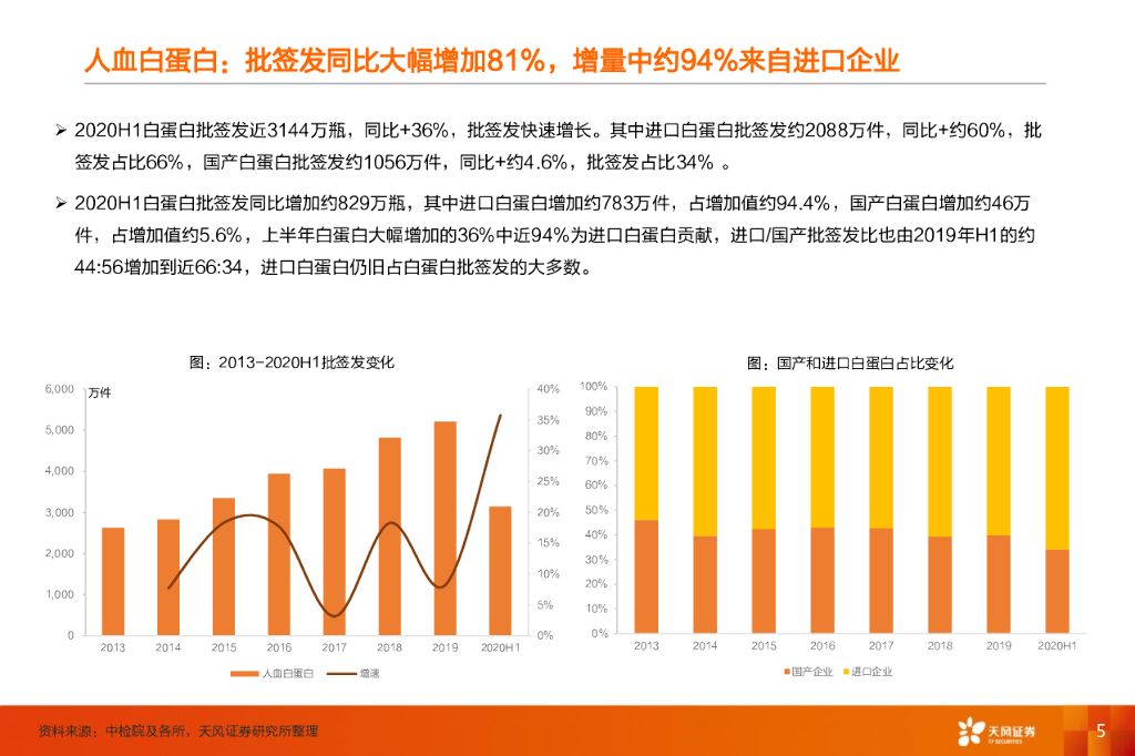 天风证券:医药生物:2020年H1血制品批签发报告——整体批签发同比大幅提升,进口白蛋白占比持续提升.pdf