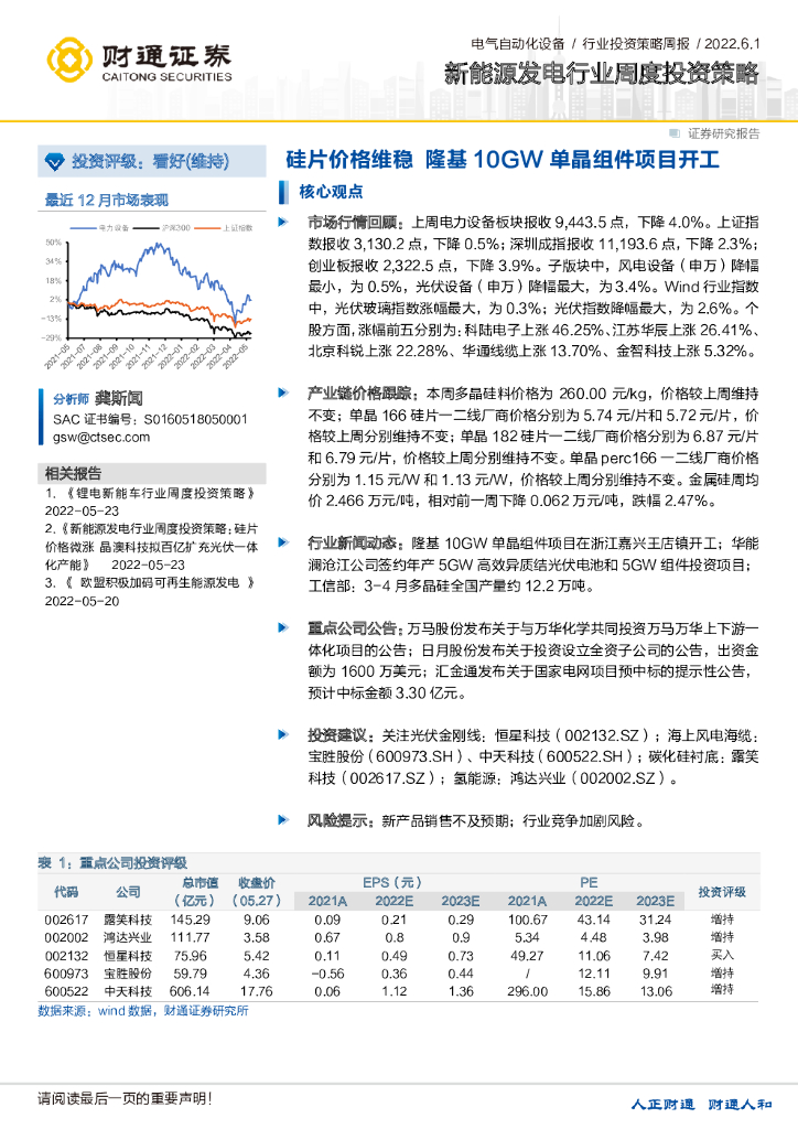 财通证券:新能源发电行业周度投资策略:硅片价格维稳 隆基10GW单晶组件项目开工.pdf