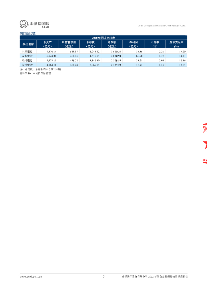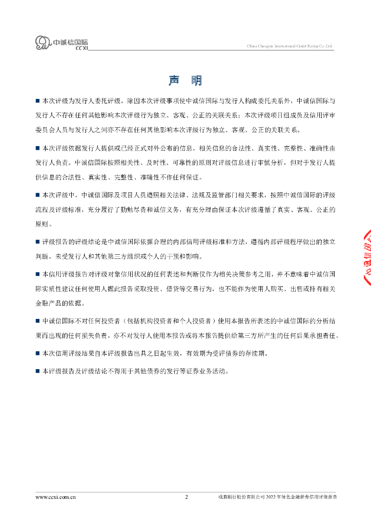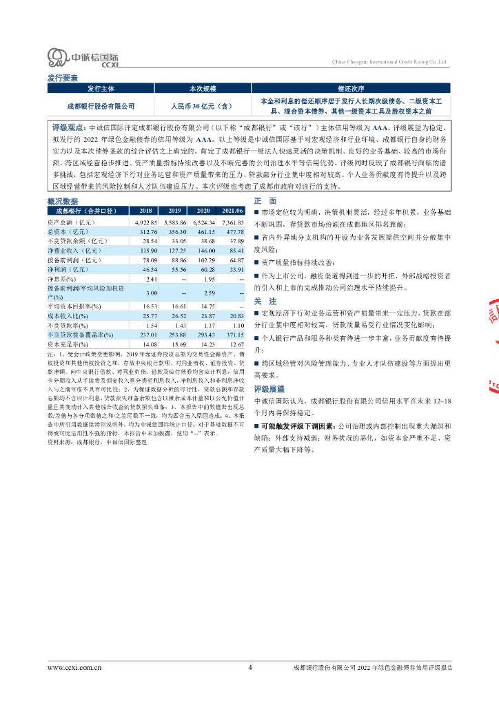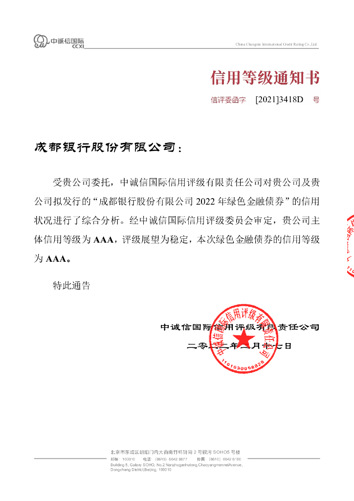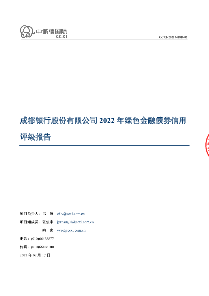 中诚信:成都银行股份有限公司2022年绿色金融债券评级报告及跟踪评级安排说明.pdf