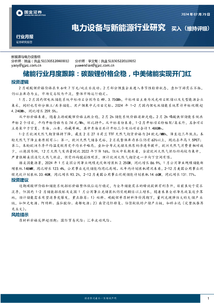 国金证券:储能行业月度跟踪:碳酸锂价格企稳,中美储能实现开门红.pdf