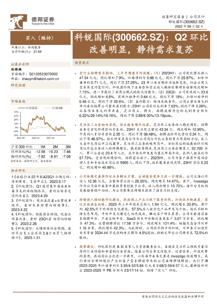 德邦证券:科锐国际(300662)-Q2环比改善明显,静待需求复苏.pdf