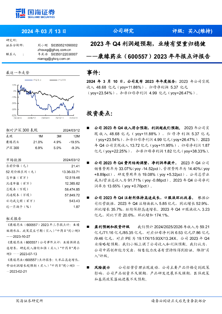 国海证券:康缘药业(600557)-2023年年报点评报告:2023年Q4利润超预期,业绩有望重归稳健.pdf