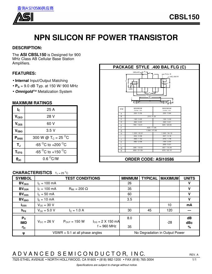 NPN SILICON RF POWER TRANSISTOR CBSL150 数据手册.pdf