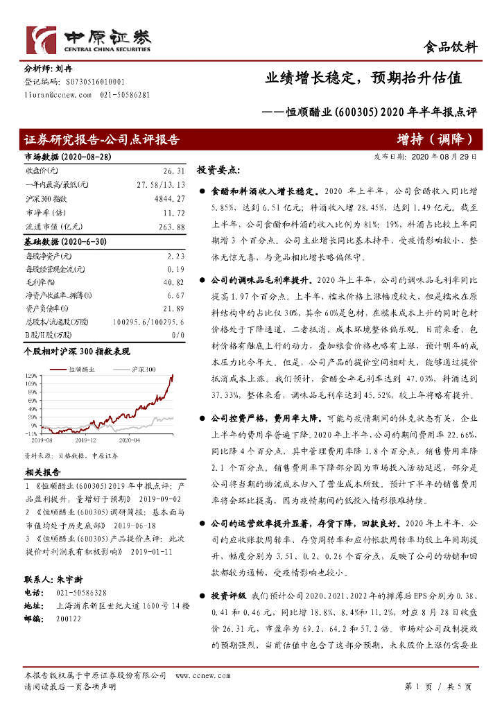 中原证券:恒顺醋业(600305)-2020年半年报点评:业绩增长稳定,预期抬升估值.pdf
