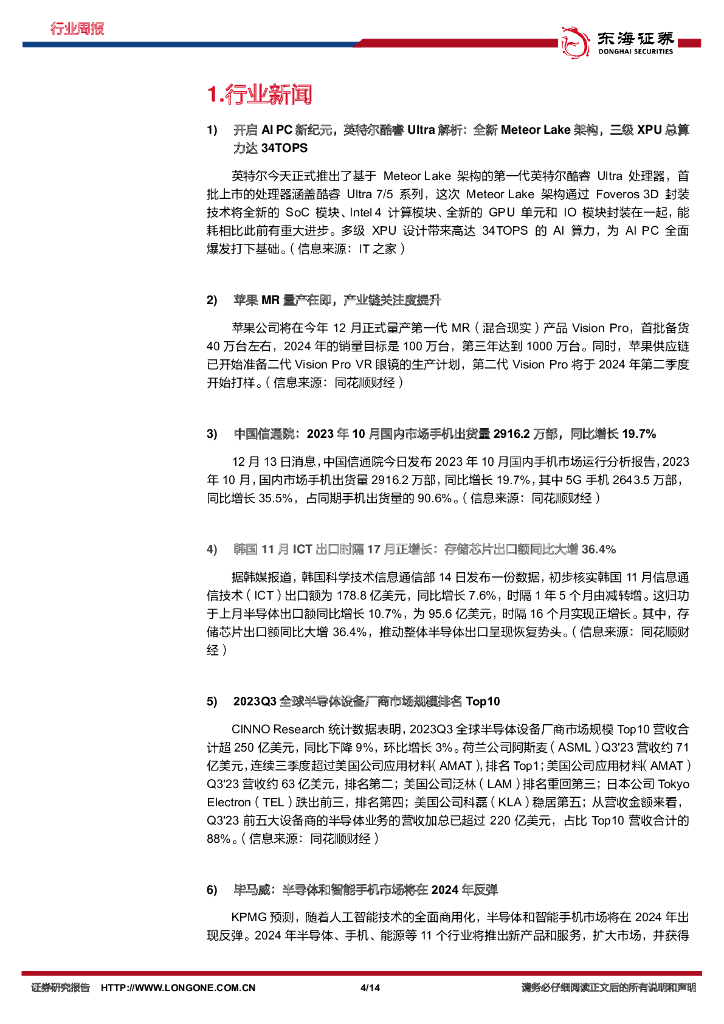 东海证券:电子行业周报:英特尔发布首款AIPC芯片Meteor Lake,Vision Pro量产在即开启消费电子新周期.pdf