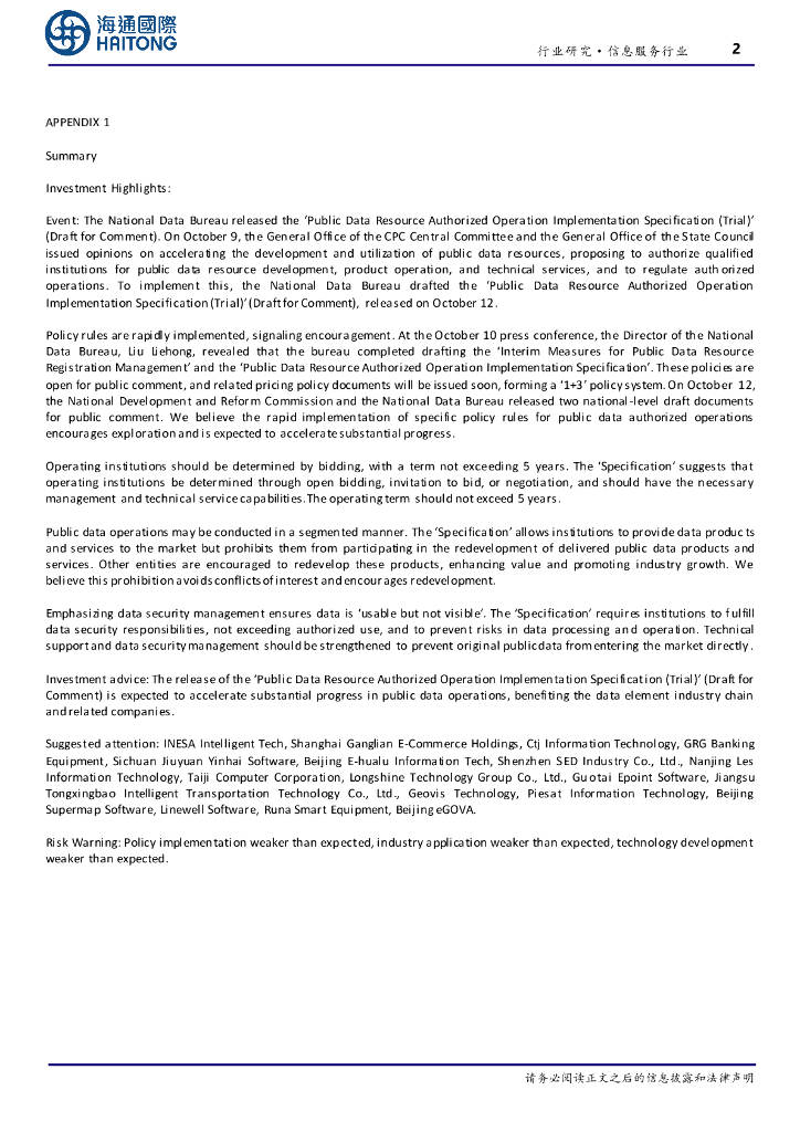 海通国际:信息服务行业信息点评:国家数据局发布《公共数据资源授权运营实施规范(试行)》(公开征求意见稿),释放积极鼓励信号.pdf