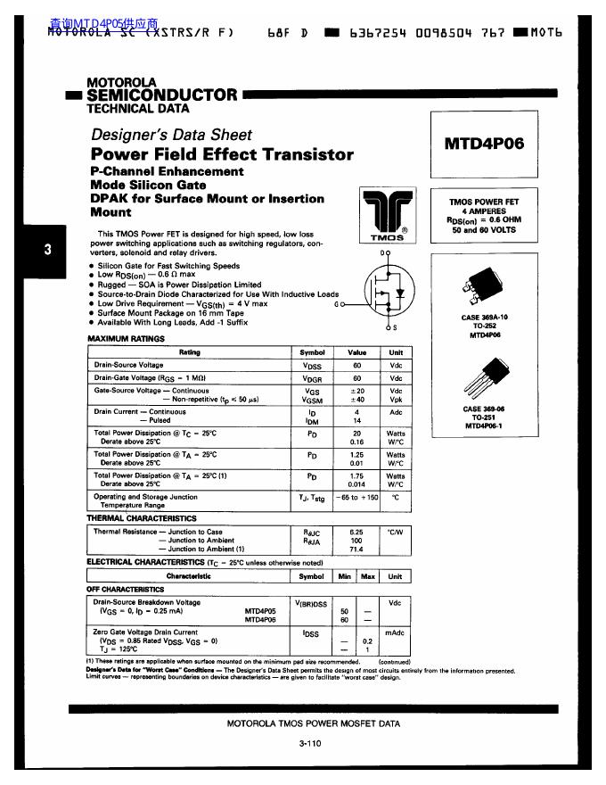 MOTOROLA Semiconductor MTD4P06 数据手册.pdf