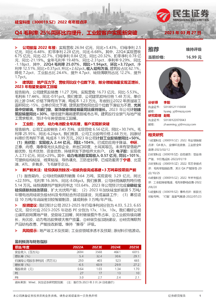 民生证券:硅宝科技(300019)-2022年年报点评:Q4毛利率25%同环比均提升,工业胶客户实现新突破.pdf