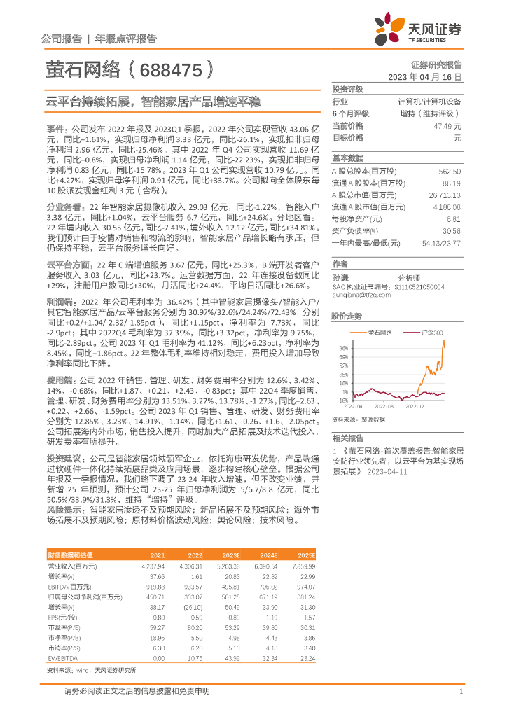 天风证券:萤石网络(688475)-云平台持续拓展,智能家居产品增速平稳.pdf