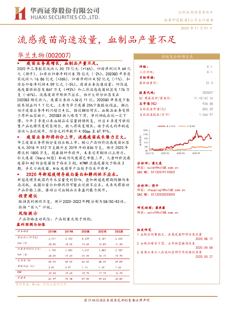 华西证券:华兰生物(002007)-流感疫苗高速放量,血制品产量不足.pdf