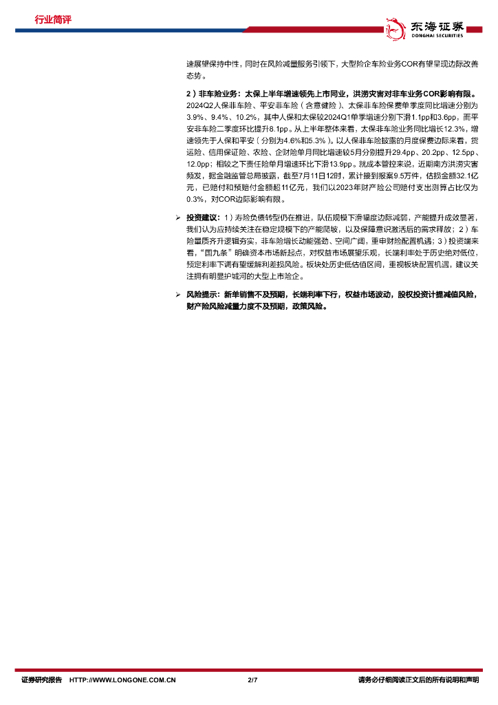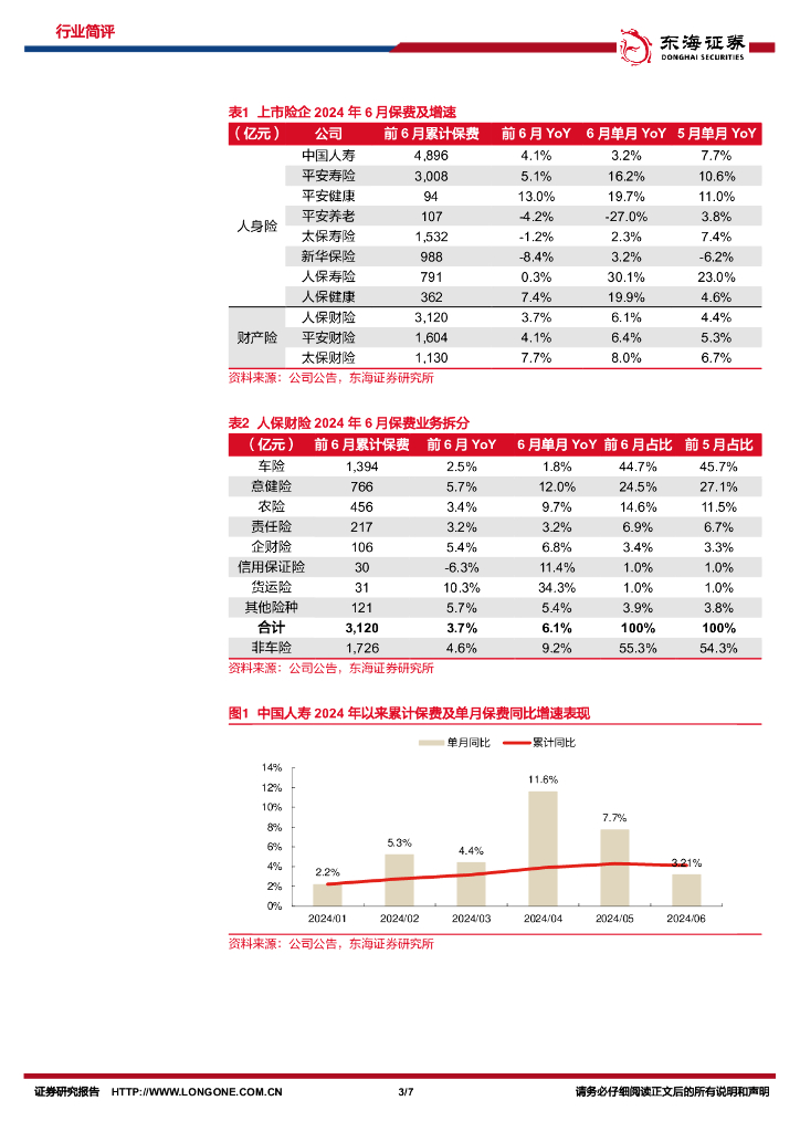 东海证券:上市险企2024年6月保费点评:续期拉动缓解寿险新单压力,非车增速提升推动财险边际改善.pdf