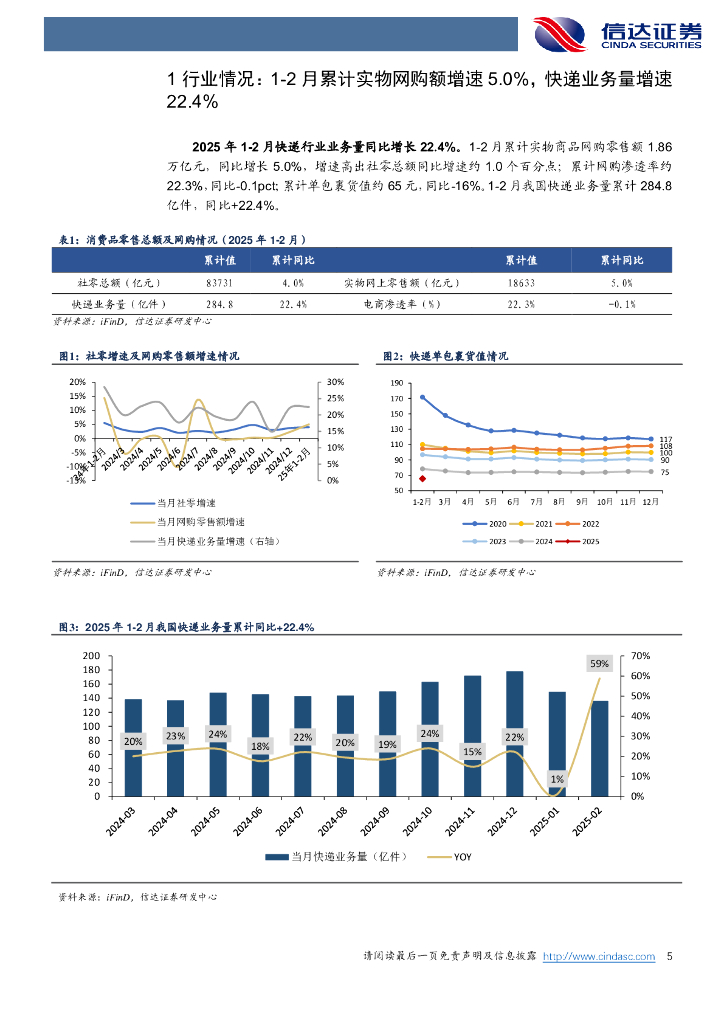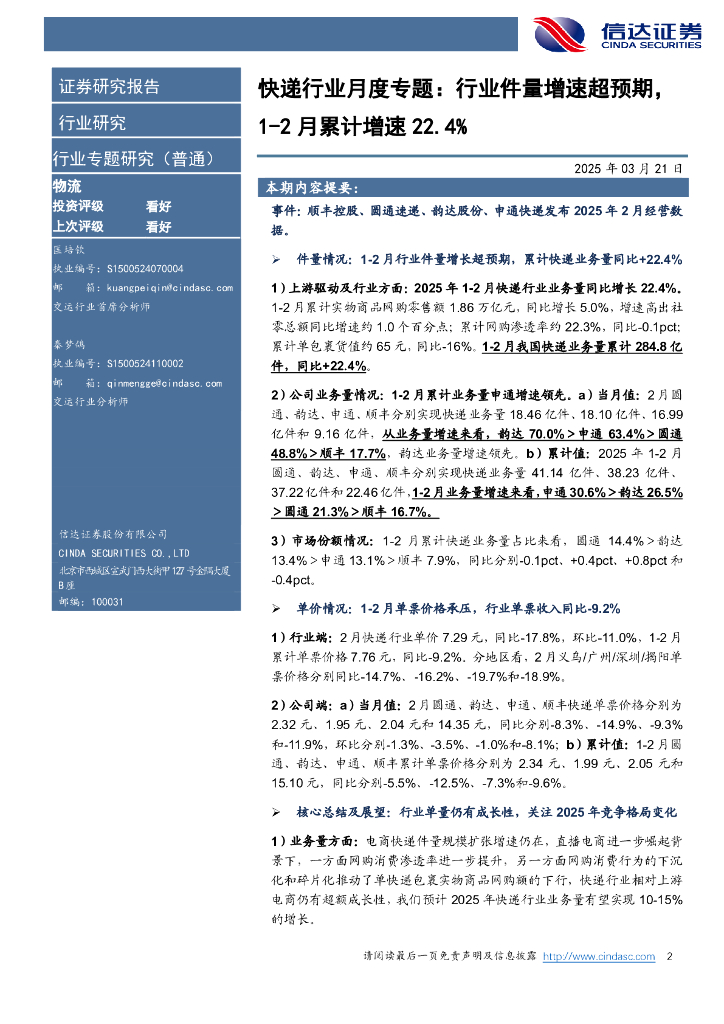 信达证券:快递行业月度专题:行业件量增速超预期,1-2月累计增速22.4%.pdf
