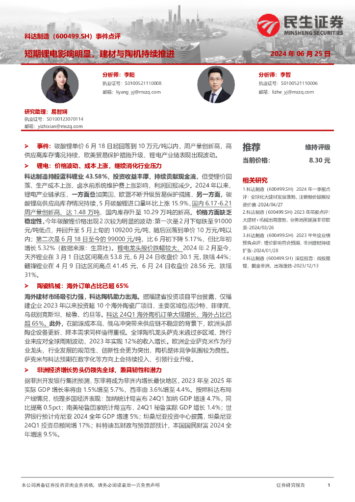 民生证券:科达制造(600499)-事件点评:短期锂电影响明显,建材与陶机持续推进.pdf