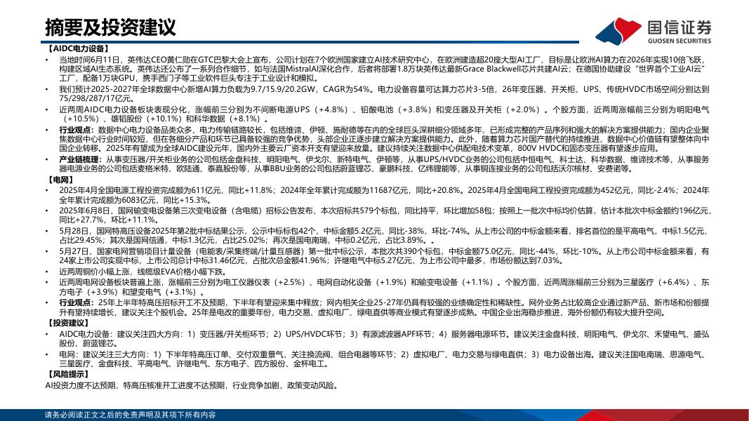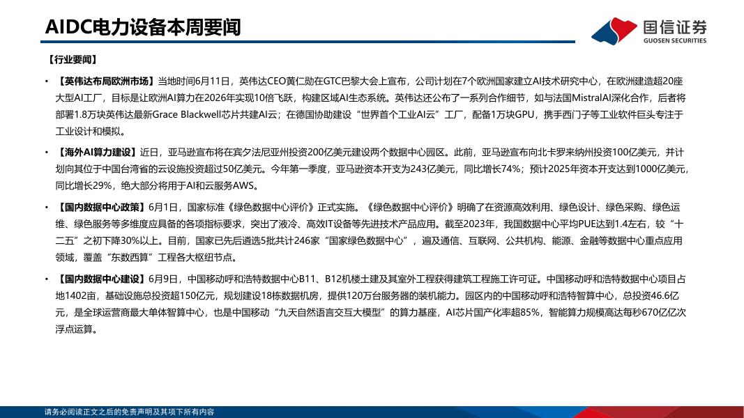国信证券:AIDC电力设备/电网产业链周评(6月第2周):英伟达宣布在欧洲建设大型AI工厂,电力设备关注出海和数据中心方向.pdf