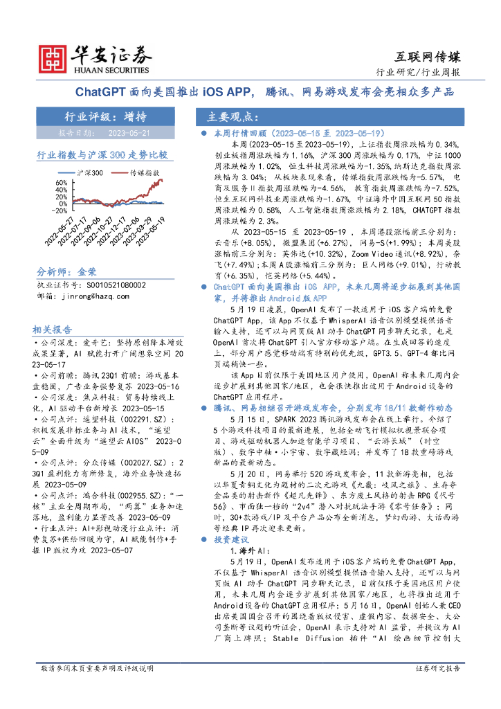 华安证券:互联网传媒行业周报:ChatGPT面向美国推出iOSAPP,腾讯、网易游戏发布会亮相众多产品.pdf