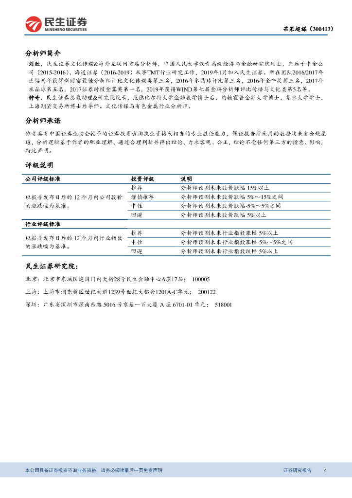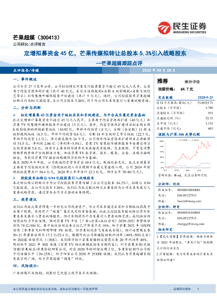 民生证券:芒果超媒跟踪点评:定增拟募资金45亿,芒果传媒拟转让总股本5.3%引入战略股东.pdf