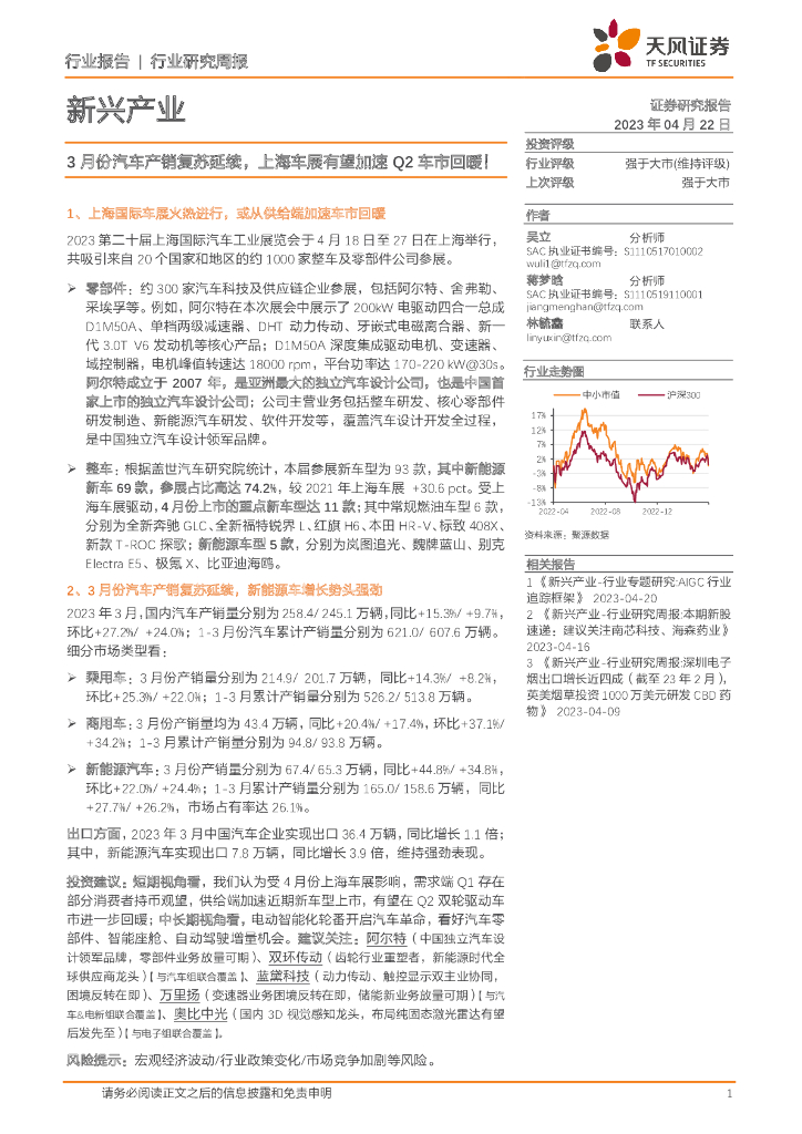 天风证券:新兴产业行业研究周报:3月份汽车产销复苏延续,上海车展有望加速Q2车市回暖!.pdf
