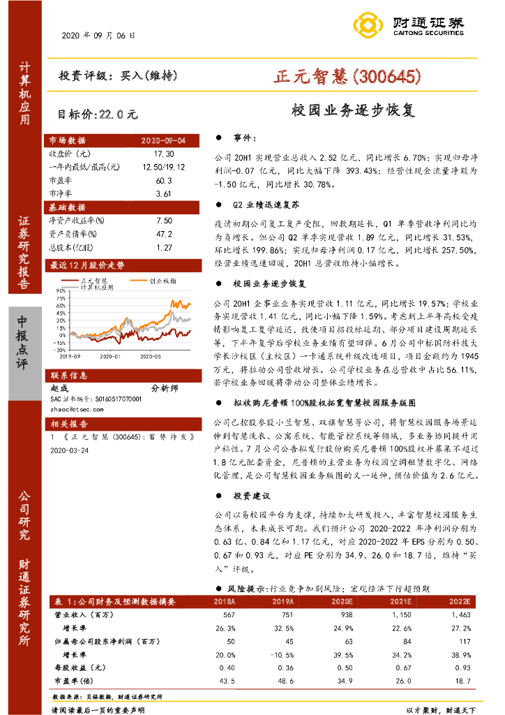 财通证券:正元智慧(300645)-校园业务逐步恢复.pdf