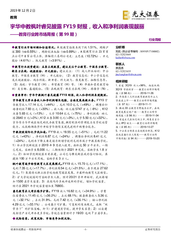 光大证券:教育行业跨市场周报(第99期):宇华中教枫叶睿见披露FY19财报,收入和净利润表现靓丽.pdf