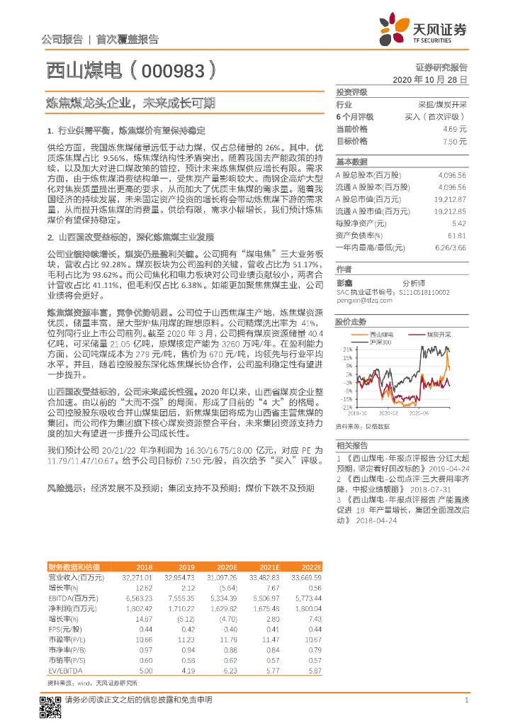 天风证券:西山煤电(000983)-炼焦煤龙头企业,未来成长可期.pdf
