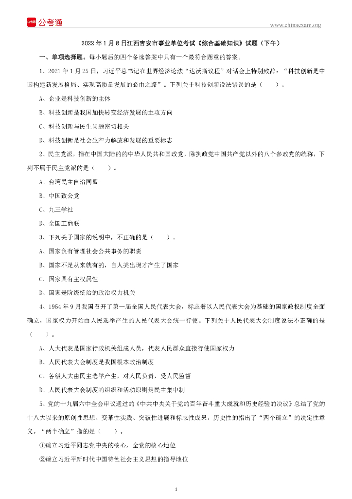 2022年1月8日江西吉安市事业单位考试《综合基础知识》试题(下午).pdf