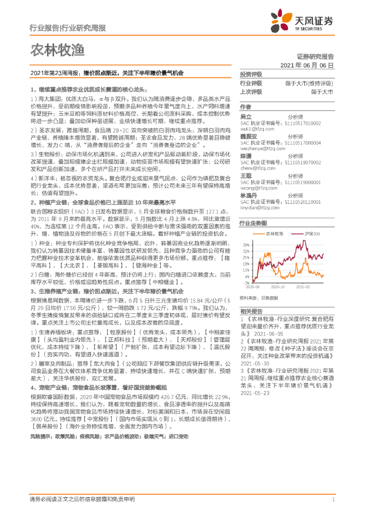 天风证券:农林牧渔2021年第23周周报:猪价拐点渐近,关注下半年猪价景气机会.pdf