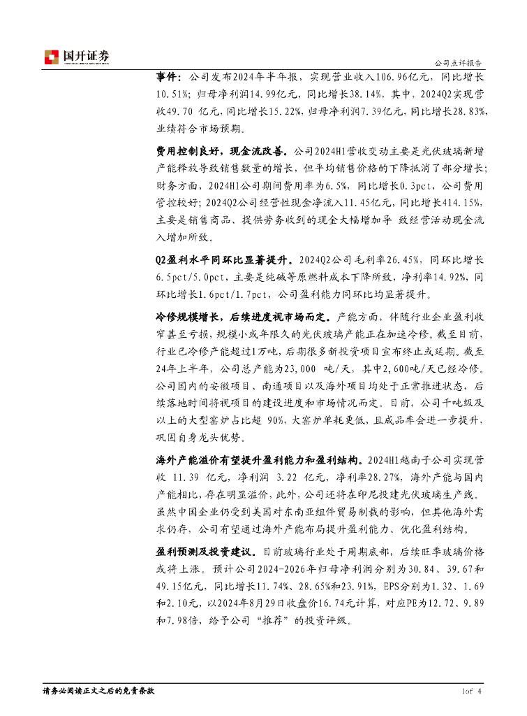 国开证券:福莱特(601865)-2024H1业绩点评:Q2盈利显著提升,行业冷修加速.pdf