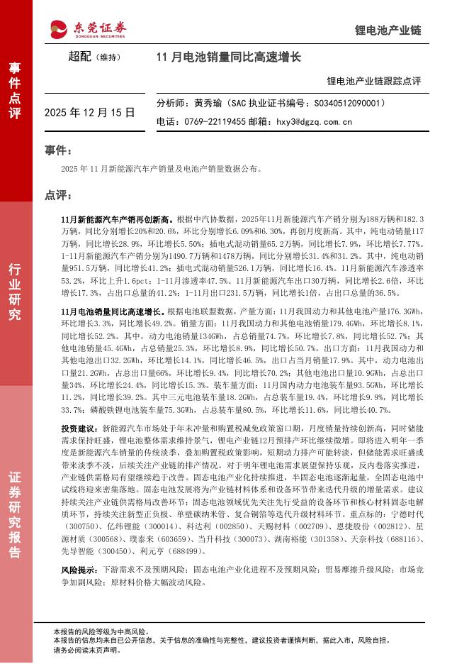 东莞证券:锂电池产业链跟踪点评:11月电池销量同比高速增长.pdf