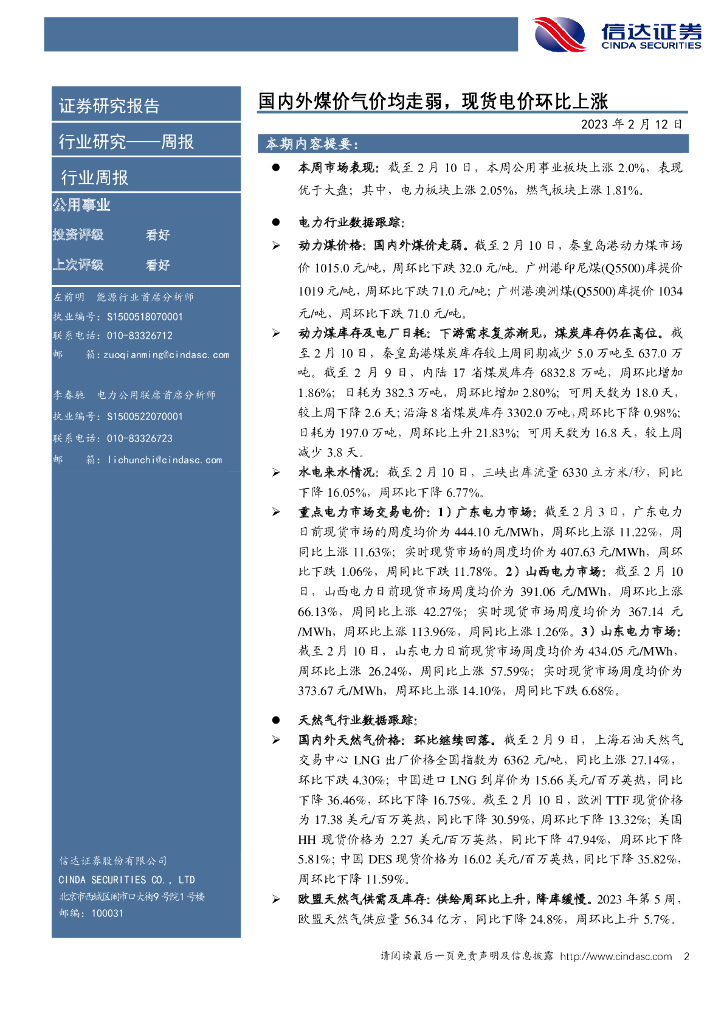 信达证券:电力天然气周报:国内外煤价气价均走弱,现货电价环比上涨.pdf