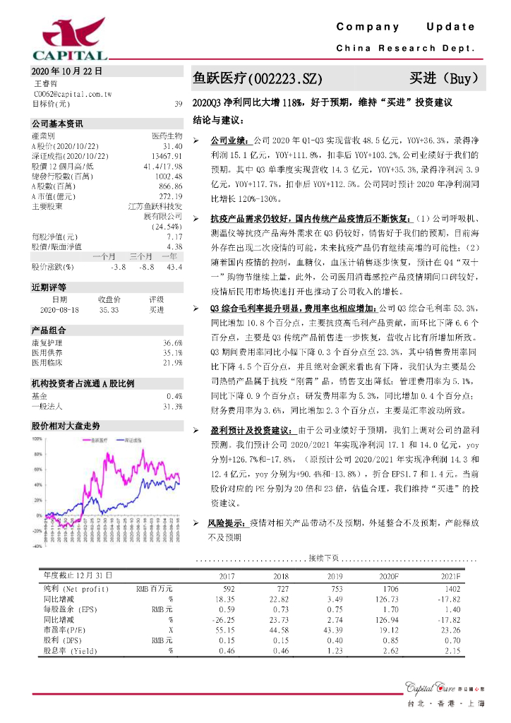 群益证券:鱼跃医疗(002223)-2020Q3净利同比大增118%,好于预期,维持“买进”投资建议.pdf