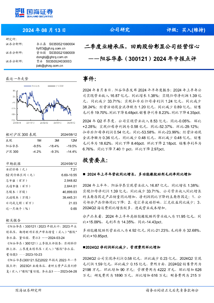 国海证券:阳谷华泰(300121)-2024年中报点评:二季度业绩承压,回购股份彰显公司经营信心.pdf