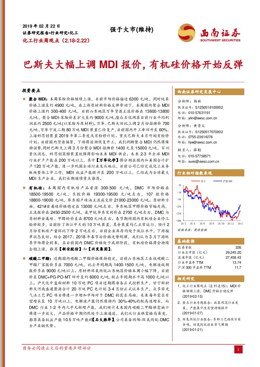 西南证券:化工行业周观点:巴斯夫大幅上调MDI报价,有机硅价格开始反弹.pdf
