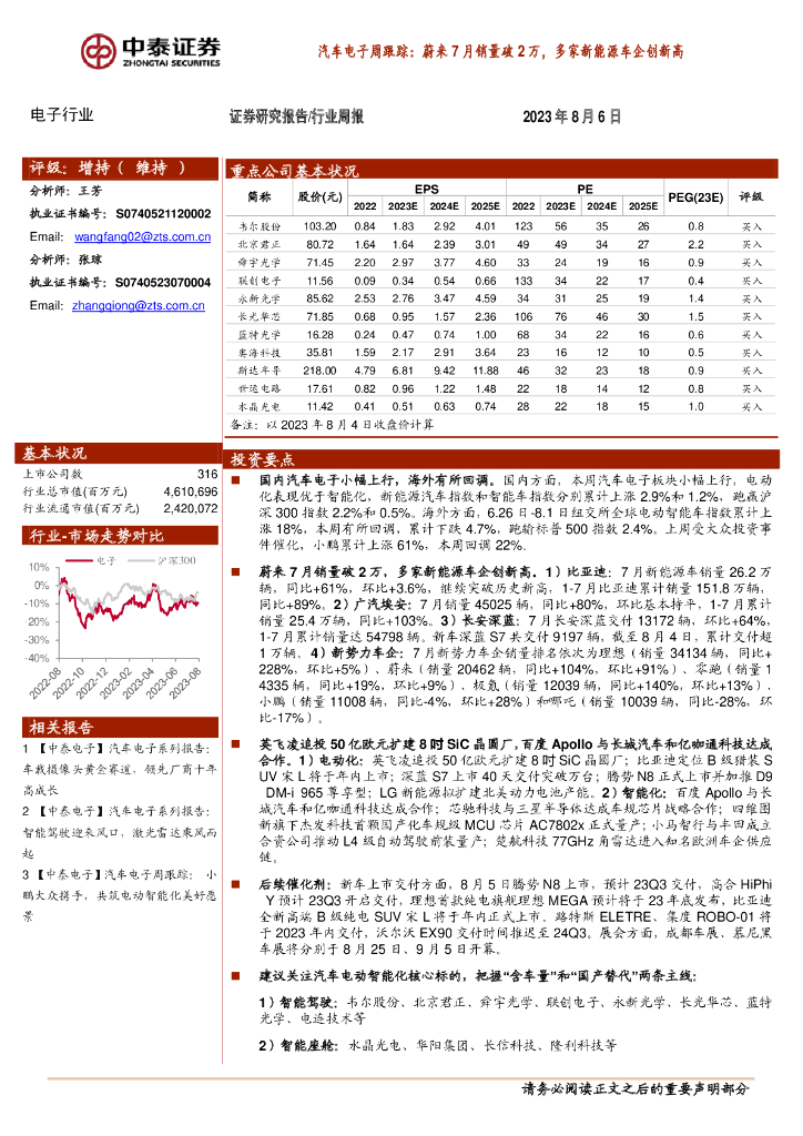 中泰证券:电子行业行业周报:汽车电子周跟踪:蔚来7月销量破2万,多家新能源车企创新高.pdf