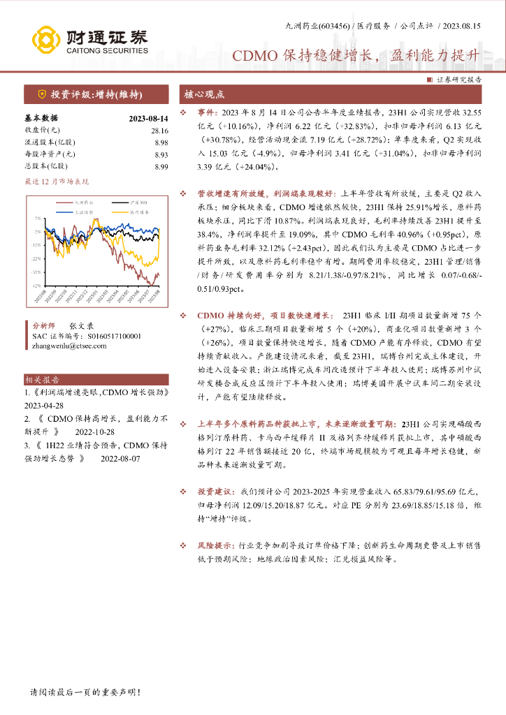 财通证券:九洲药业(603456)-CDMO保持稳健增长,盈利能力提升.pdf