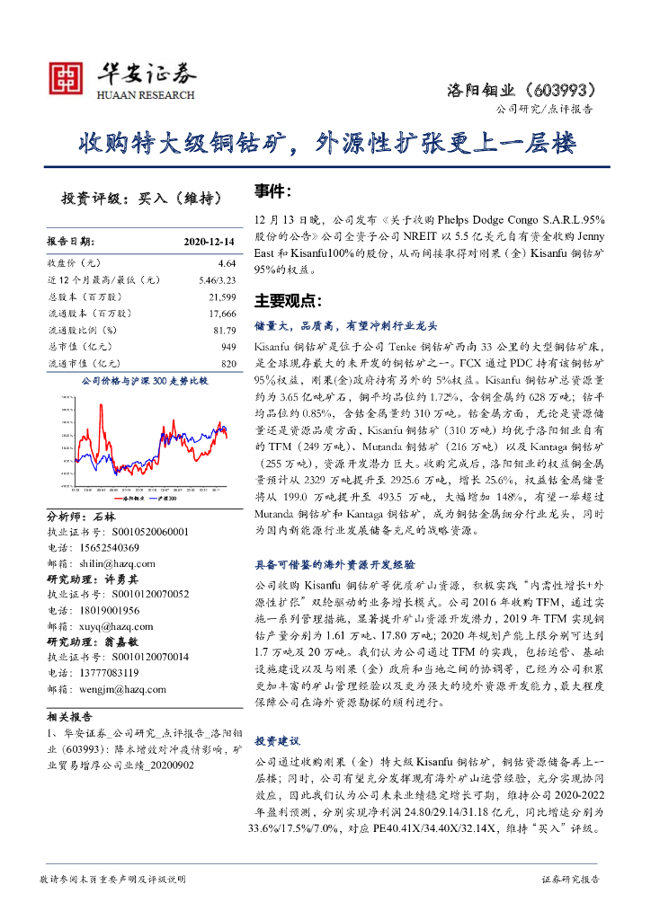 华安证券:洛阳钼业(603993)-收购特大级铜钴矿,外源性扩张更上一层楼.pdf