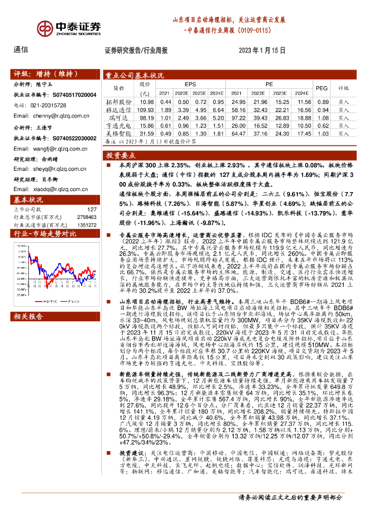 中泰证券:中泰通信行业周报:山东项目启动海缆招标,关注运营商云发展.pdf