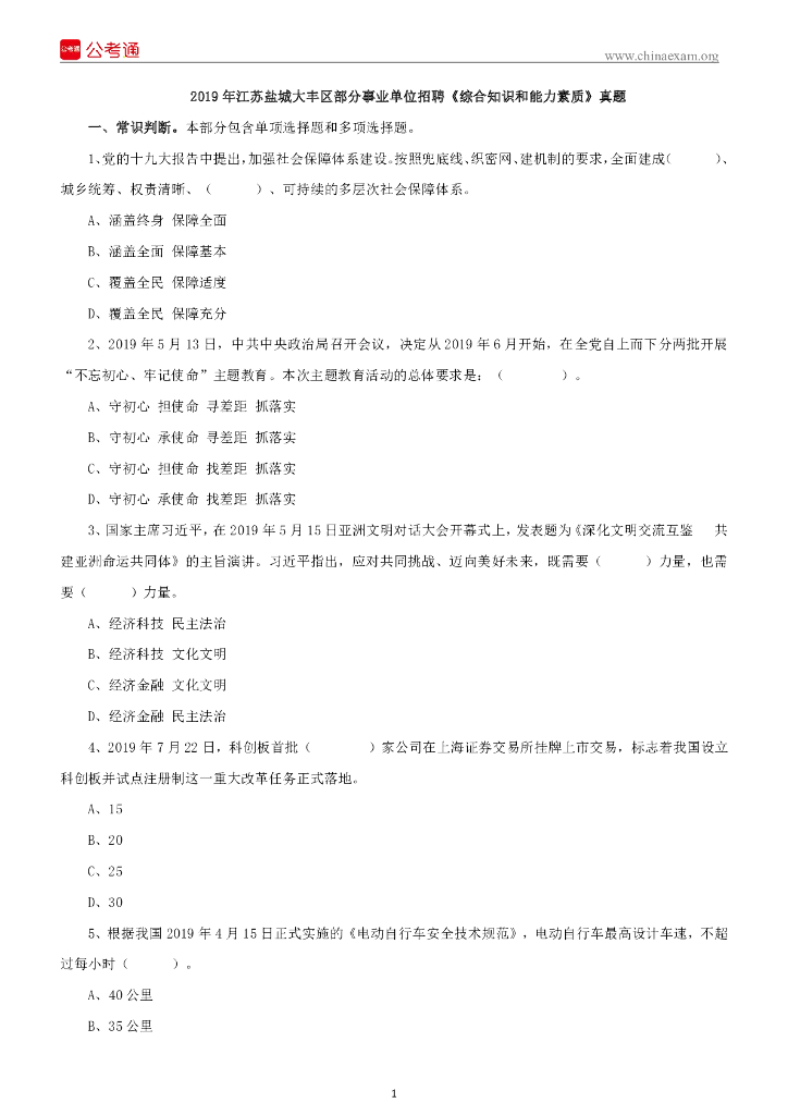 2019年江苏盐城大丰区部分事业单位招聘《综合知识和能力素质》真题.pdf