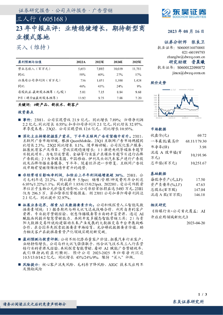 东吴证券:三人行(605168)-23年中报点评:业绩稳健增长,期待新型商业模式落地.pdf