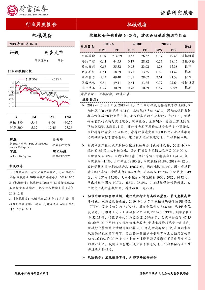 财富证券:机械设备行业月度报告:挖掘机全年销量超20万台,建议关注逆周期调节行业.pdf