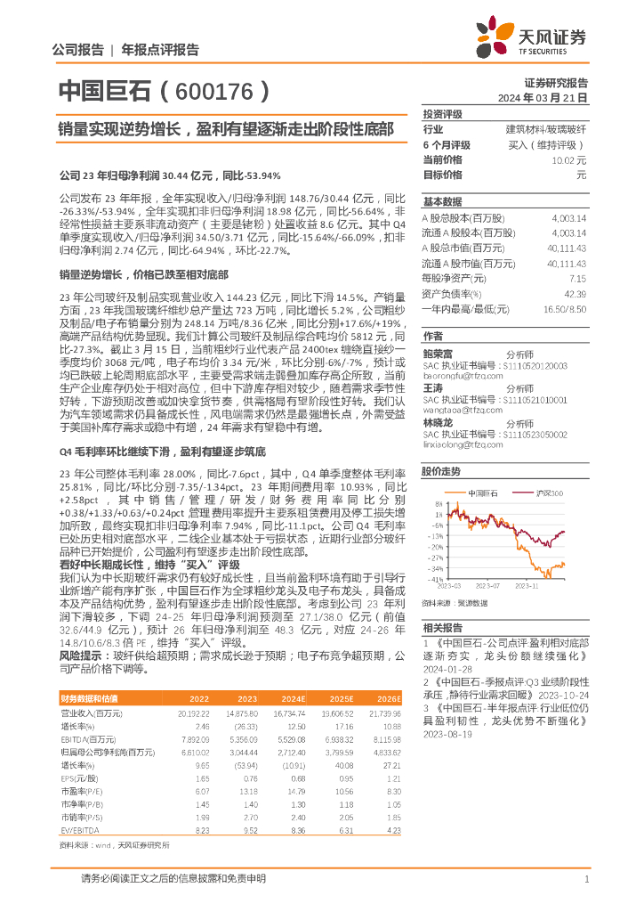 天风证券:中国巨石(600176)-销量实现逆势增长,盈利有望逐渐走出阶段性底部.pdf