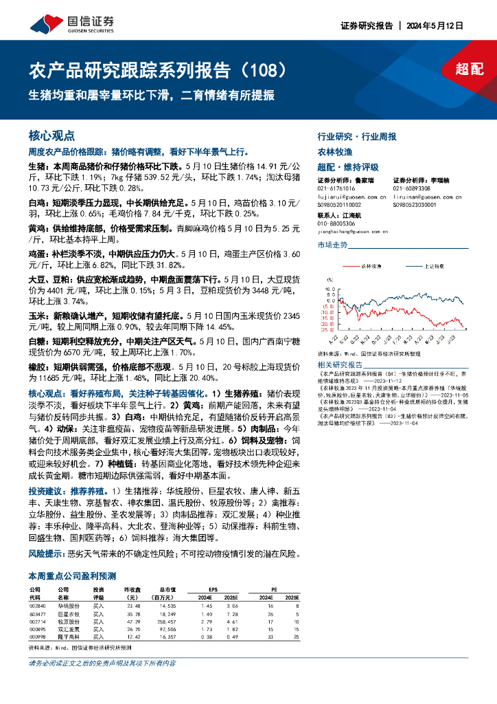 国信证券:农产品研究跟踪系列报告(108):生猪均重和屠宰量环比下滑,二育情绪有所提振.pdf