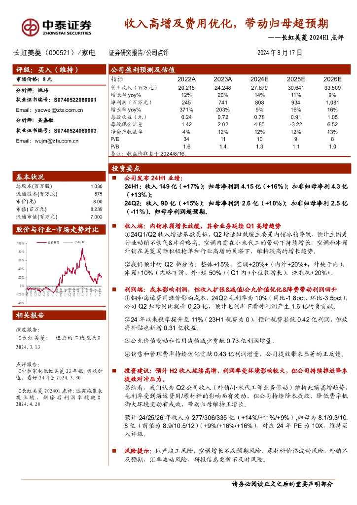 中泰证券:长虹美菱2024H1点评:收入高增及费用优化,带动归母超预期.pdf