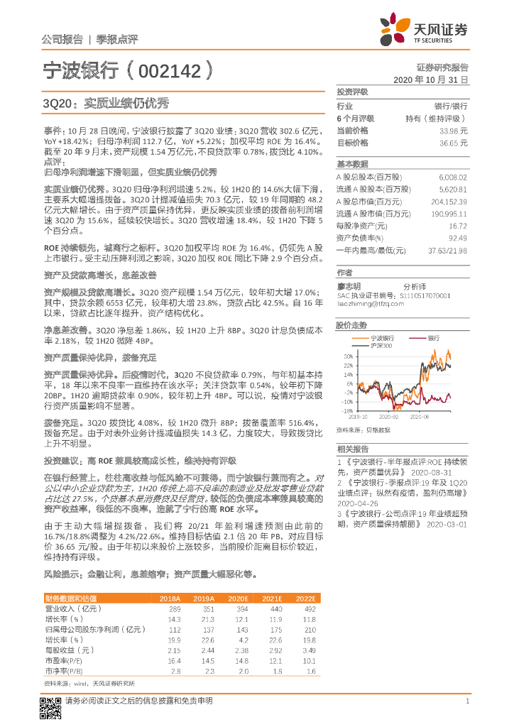 天风证券:宁波银行(002142)-3Q20:实质业绩仍优秀.pdf