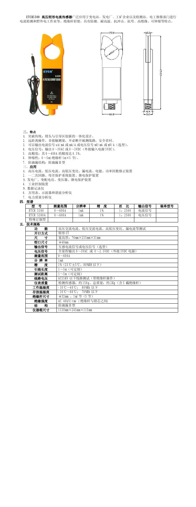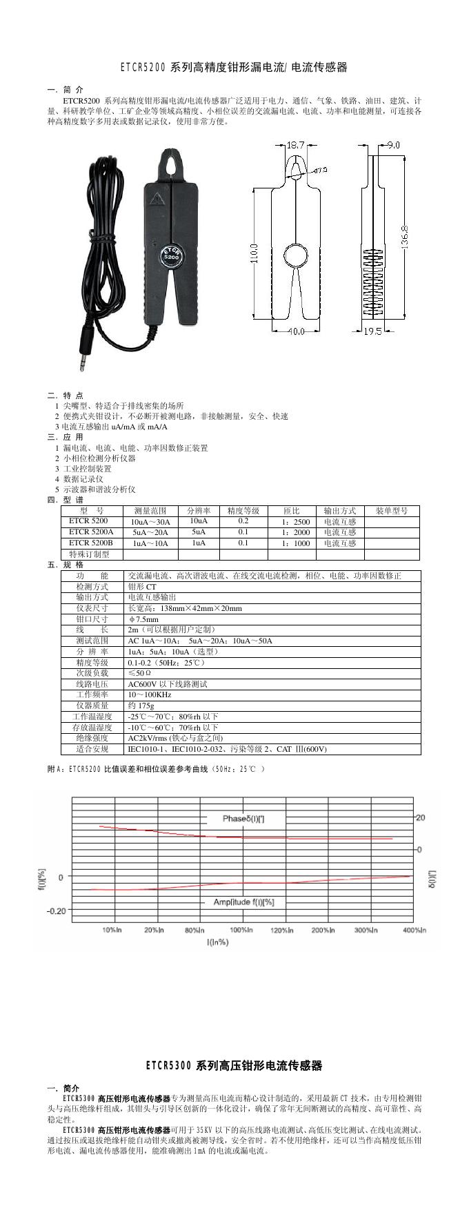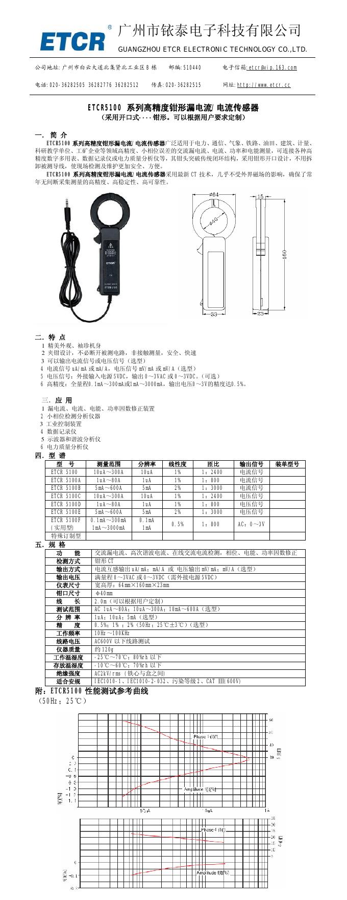 广州市铱泰电子科技有限公司 ETCR5100 系列高精度钳形漏电流/电流传感器 规格手册.pdf