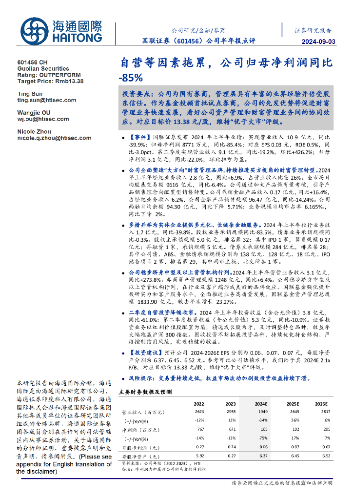 海通国际:国联证券(601456)-公司半年报点评:自营等因素拖累,公司归母净利润同比+23%.pdf
