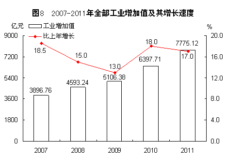 全部工业增加值7775.12亿元,比上年增长17.0%,其中规模以上工业增加值7552.39亿元,增长17.5%。工业产品销售率97.56%,比上年下降0.28个百分点。