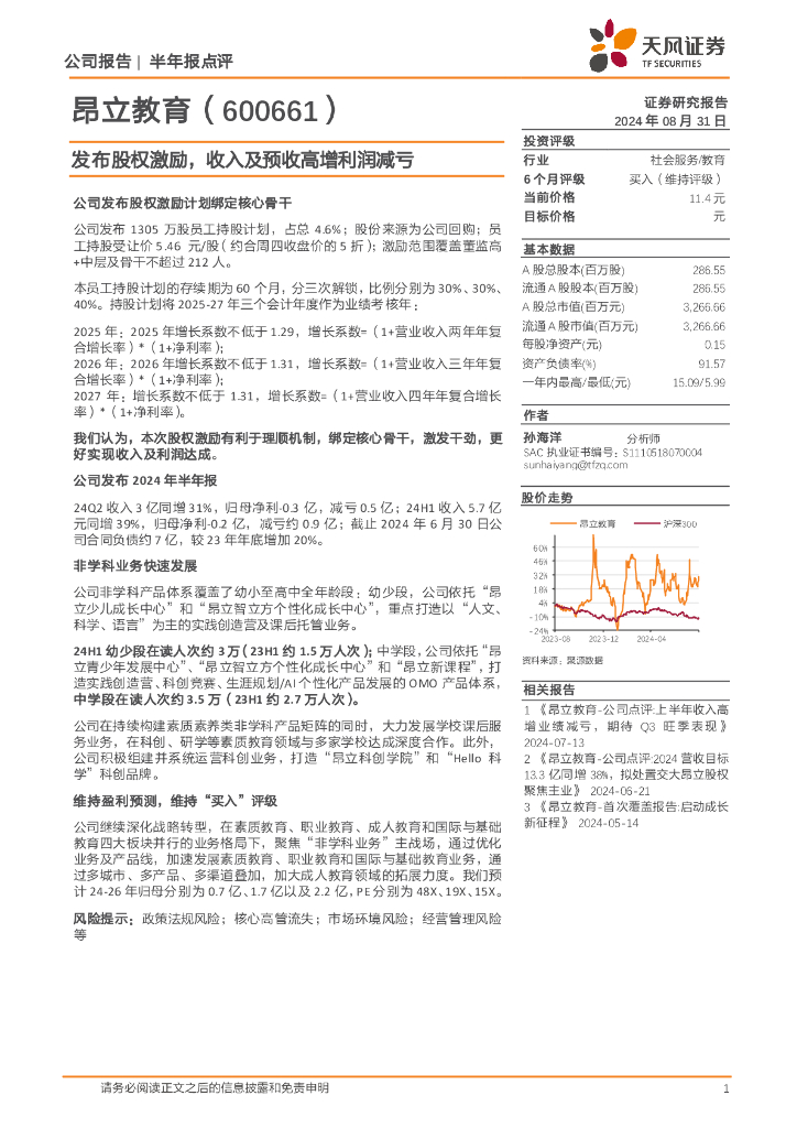 天风证券:昂立教育(600661)-发布股权激励,收入及预收高增利润减亏.pdf